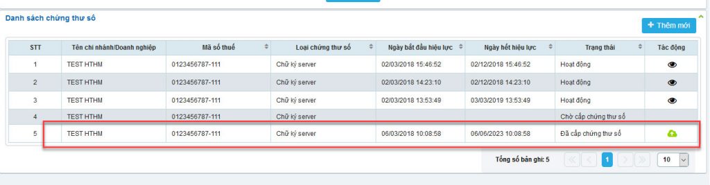 Lưu ý: Có thể tồn tại nhiều chứng thư số ở trạng thái Hoạt động, khi lập hóa đơn hệ thống sẽ lấy chứng thư số ở trạng thái Hoạt động có ngày bắt đầu hiệu lực gần nhất.