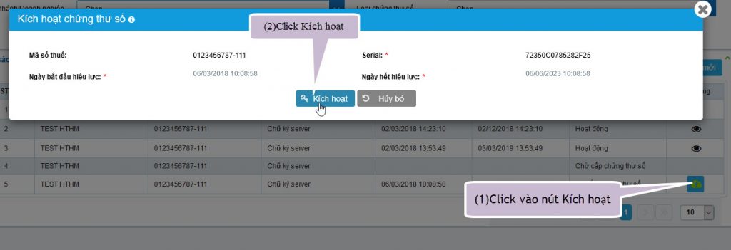 Bước 5: Người dùng thực hiện kích hoạt chứng thư số đã được cấp, sau khi kích hoạt thành công chứng thư số ở trạng thái Hoạt động