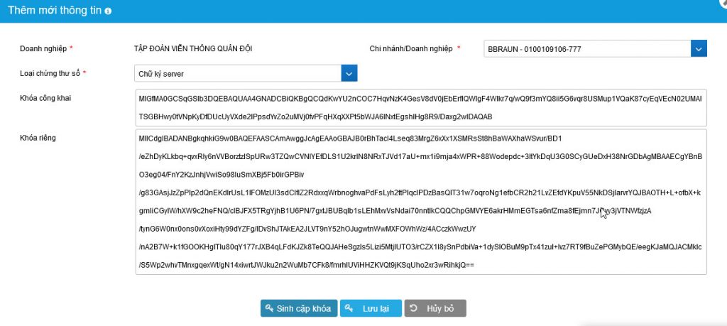 +) Nhấn tạo chứng thư số, lưu chứng thư số tại máy người dùng sau đó admin doanh nghiệp tự add file cer chứng thư số lên hệ thống hóa đơn điện tử tại giao diện: Khởi tạo thông tin doanh nghiệp/Thêm mới chứng thư số
