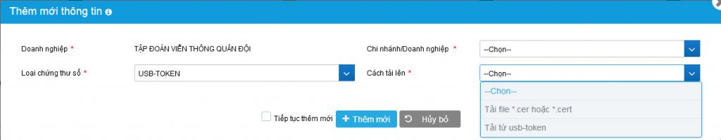 3. Chức năng Thêm mới thông tin chứng thư số – Nếu chọn Loại chứng thư số = USB-TOKEN