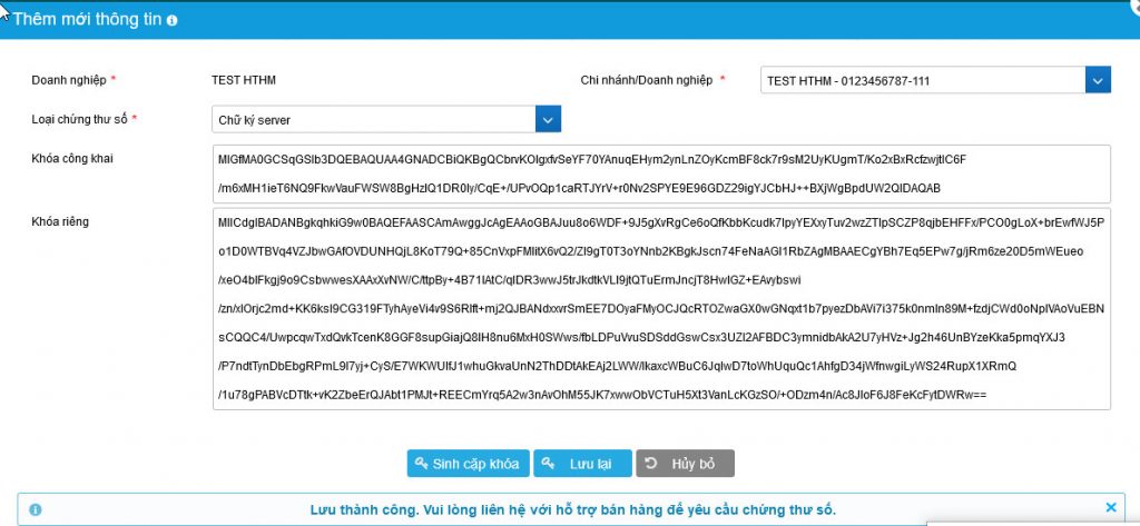 +) Nhấn tạo chứng thư số, lưu chứng thư số tại máy người dùng sau đó admin doanh nghiệp tự add file cer chứng thư số lên hệ thống hóa đơn điện tử tại giao diện: Khởi tạo thông tin doanh nghiệp/Thêm mới chứng thư số